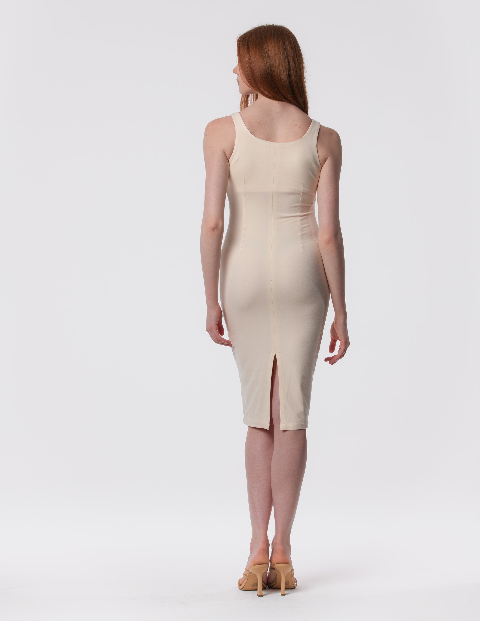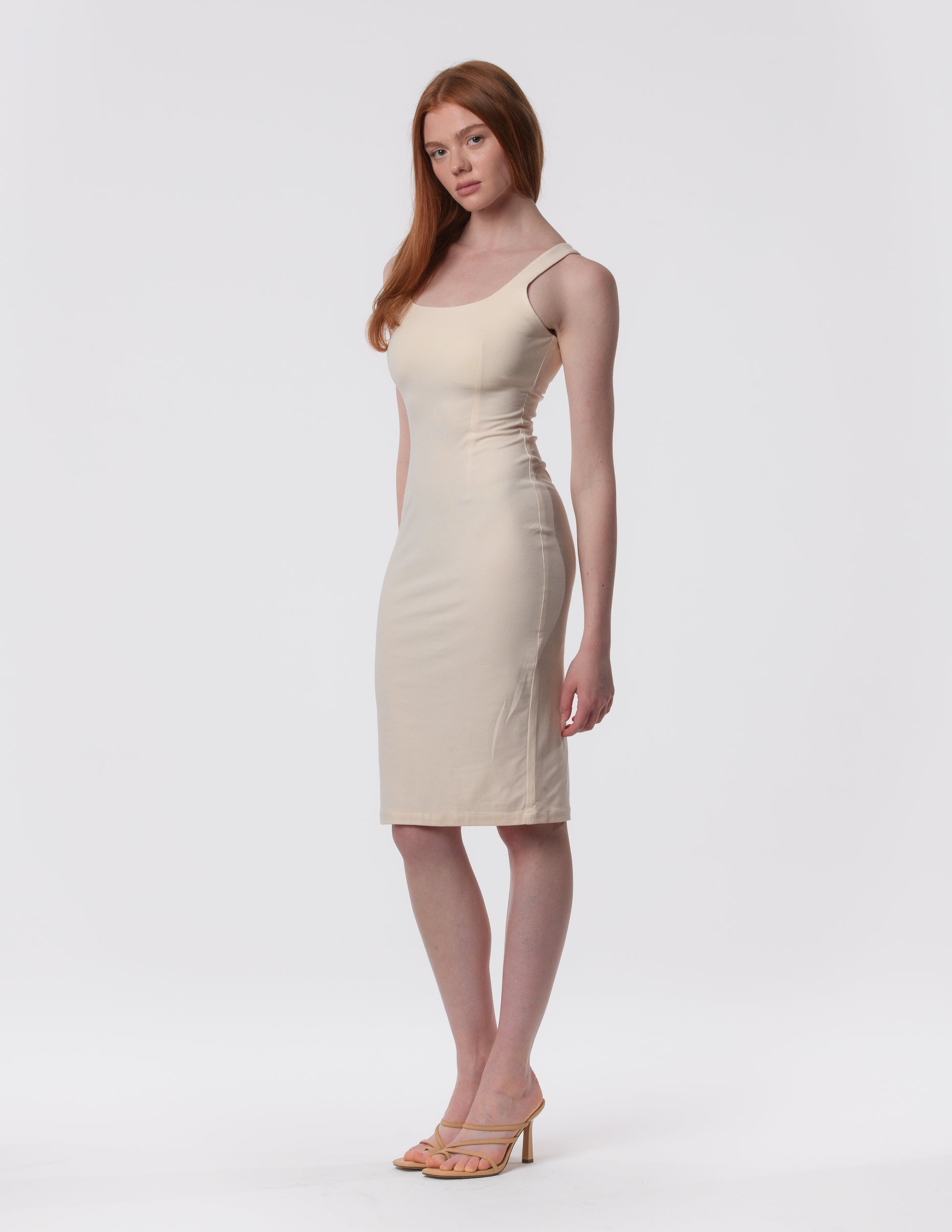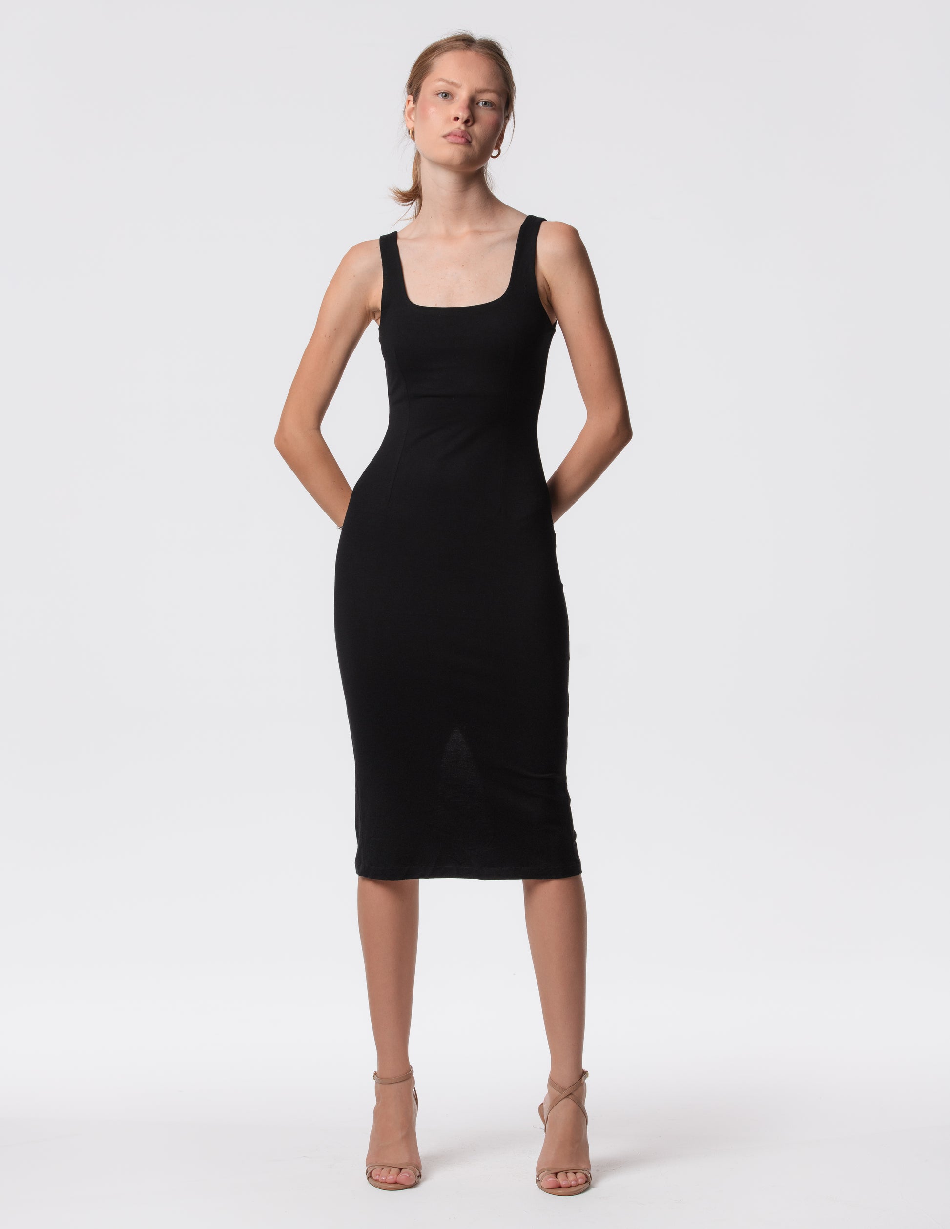 A timeless, body-flattering square neck midi dress made from soft stretch cotton for all-day comfort. Designed with a fitted silhouette that contours beautifully without feeling restrictive, it offers a refined balance of structure, softness, and ease.